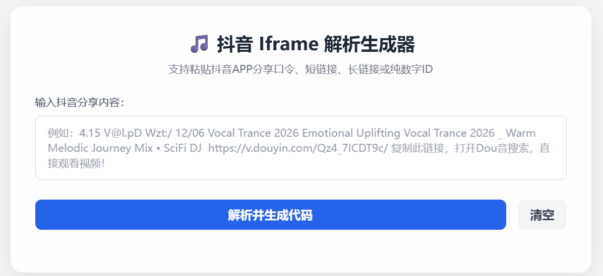 <h1 class="text-2xl font-bold text-gray-800 mb-2 text-center">🎵 抖音 Iframe 解析生成器</h1>